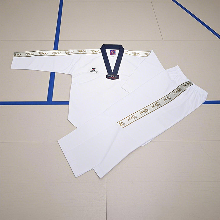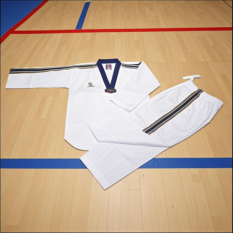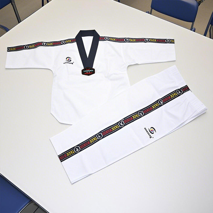 WOOSUNG هي شركة متخصصة في تصنيع أزياء التايكوندو المختلفة. زي التايكوندو المخطط الخاص بنا مصنوع من نسيج قطني مسامي، مع خياطة معززة، وأحزمة خصر برباط على البنطال، ومنصات للركبة، مما يجعلها متينة ومرنة ومناسبة للتدريب والمسابقات.