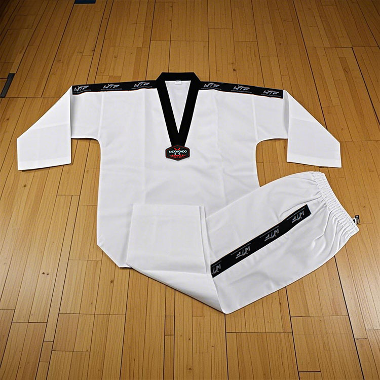 من حيث التصميم، يبرز زي التايكوندو المخطط بنمطه المخطط الفريد. تشبه هذه الخطوط الألحان المتدفقة، وتضيف طبقات بصرية وديناميكية إلى الزي الرسمي. بالنسبة لجزء السترة، نستخدم تقنية خياطة معززة دقيقة وخياطة ملائمة للجسم لضمان قدرتك على التحرك بسلاسة وحرية أثناء التدريب مع الحفاظ على متانة الملابس. شارات مطرزة رائعة وعلاجات الحواف.